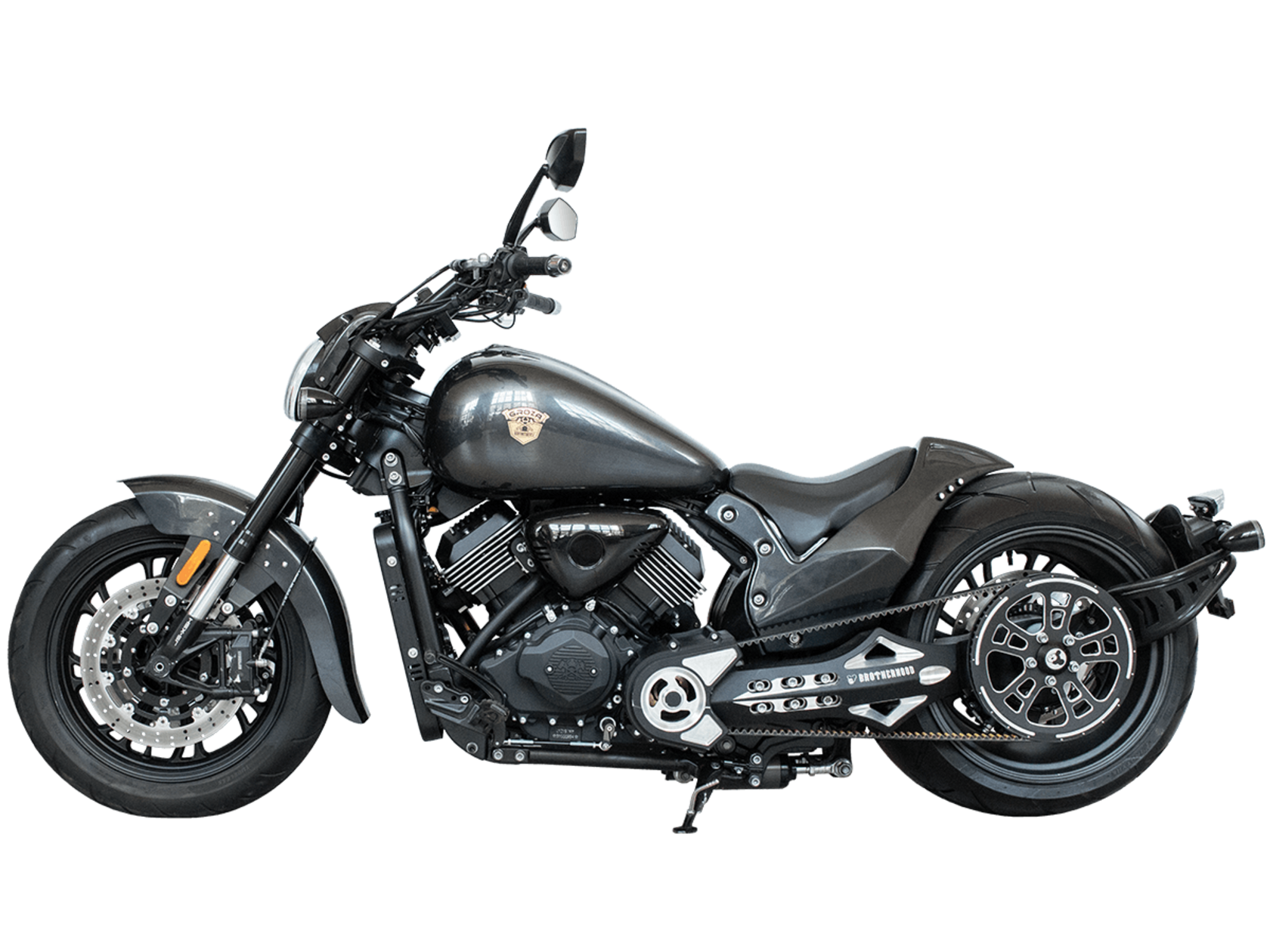 GROZA Wolverine 800 – ультимативный круизёр, который будто бы сошёл со страниц эксклюзивного каталога кастом-байков. Модель названа в честь росомахи – одного из самых свирепых, ловких и бескомпромиссных хищников в животном мире. Пилотируя этот байк, вы не имеете шанса остаться в потоке незамеченным. А в случае, если кто-то на светофоре решит посостязаться в дрэг-рейсинге, 800-кубовый V-твин и гигантская задняя покрышка не оставят преследователям никаких шансов.Двухцилиндровый V-образный четырёхтактный двигатель объёмом 800 см3 мощностью 61 л.с. при высоких показателях динамики и отличном крутящем моменте способен разгонять аппарат до 180 км/ч. Инжекторный впрыск топлива с инжектором DELPHI увеличивает топливную экономичность, а также позволяет добиться высокой приёмистости и неприхотливости агрегата. Привод на ведущее колесо осуществляется ремнём знаменитой марки USA Gates. Жидкостная система охлаждения не допустит перегрева мотора даже при самом агрессивном вождении. Радиатор оснащён фирменными вентиляторами Panasonic, способными обеспечить сильный отвод тепла даже на перегруженных городских дорогах. Металлическая крышка на радиаторе эффективно защищает от ударов твёрдых предметов.Аппарат имеет 6-ступенчатую механическую коробку передач с классической схемой “1-N-2-3-4-5-6”. На мотоцикл установлены литые алюминиевые диски диаметром 17 дюймов спереди и 18 дюймов сзади. Ширина передней покрышки – 140 мм, а задней – рекордные 360 мм! С неровностями дороги эффективно справляются телескопическая вилка перевёрнутого типа спереди и маятник с двумя газонаполненными амортизаторами сзади. Подвеска имеет 7 ступеней регулировки, что обеспечивает лёгкую перестройку на различные режимы езды. Для всего класса круизёров такая опция – большая редкость. Эффективное и безопасное замедление с любых скоростей обеспечивают гидравлические дисковые тормоза спереди и сзади от компании NISSIN. Мотоцикл оснащён ультраминималистичным хвостовым обтекателем и изумительным “ракетным” глушителем с углепластиковыми щитками для защиты ноги, произведённым легендарной фирмой AKRAPOVIC.Wolverine 800 сочетает в себе отличные технические характеристики, богатое оснащение, комфорт и надёжность, что позволяет вам ощутить настоящую свободу на любой дороге.
