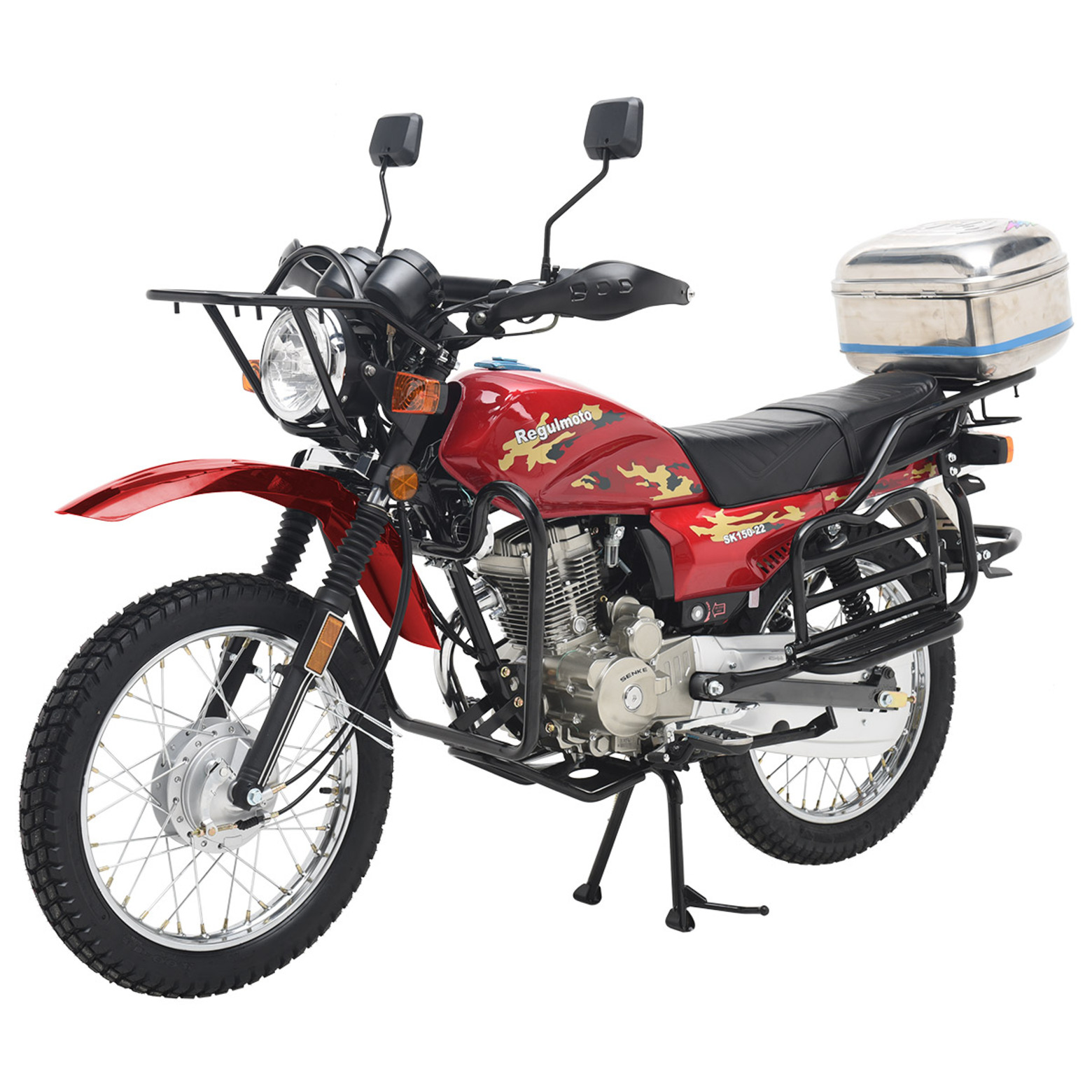 Мотоцикл Regulmoto SK 150-22 – классический «дорожник» с надежным и экономичным малокубатурным двигателем. Данная модель изготавливается на собственных мощностях крупного китайского производителя Senke.Несмотря на классический внешний вид Regulmoto SK 150-22 отличается достаточно интересным и продуманным дизайном. В раме мотоцикла установлен одноцилиндровый 4-тактник с воздушным охлаждением с рабочим объемом в 149 см3. Двигатель можно запускать как кнопкой электростартера, так и при помощи традиционного кик-стартера. В целом байк выглядит лаконичным и современным – еще одной приметой актуальных трендов стали спицованные диски переднего 18-дюймового и заднего 18-дюймового колес. Характерная для «дорожников» подвеска представлена телескопической вилкой спереди и двумя амортизаторами сзади.Широкое комфортное сиденье и вместительный бак Regulmoto SK 150-22 недвусмысленно указывают на назначение мотоцикла, окончательную ясность вносят багажник, складывающиеся пассажирские подножки и наличие мощной центральной подножки. Безопасность эксплуатации на дорогах общего пользования обеспечивают обязательный комплект зеркал заднего вида и светового оборудования, включающего фару головного света, светодиодные поворотники и стоп-сигнал. Этот мотоцикл станет отличным выбором в качестве транспортного средства на каждый день и позволит своему обладателю с комфортом решать широкий круг повседневных задач.