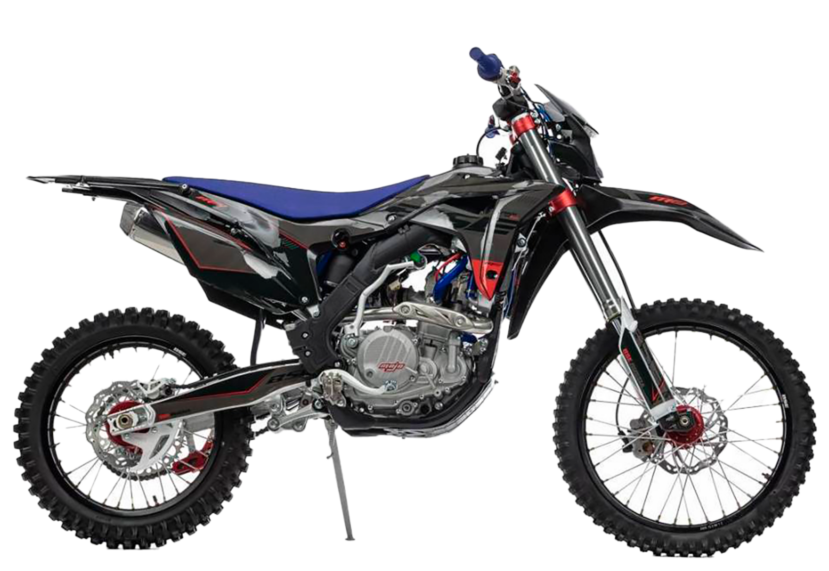 Рама алюминиевая сваренная роботизированным способом, поэтому швы и проварка не вызывает нареканий, геометрия и профиль сварных элементов являются копией рамы Honda crf 250. В базе установлена защита картера.Шасси: Вилка перевернутого типа с регулировкой отбоя, сзади алюминиевый маятник связанный с задним амортизатором через систему линков (pro-link), амортизатор рюкзачного типа длиной 480 мм, с регулировками отбоя, сжатия и пред нагрузкой. Двигатель ZS177MM 250 см3, 4 клапанный, водяного охлаждения, мощностью 27 л.с. производства компании Zongshen с электро и кик стартером.Траверсы, ступицы, звезда, анодированы в красный. Передний и задний диск имеет пластиковую защиту.У нас Вы можете купить этот мотоцикл с бесплатной доставкой по РФ и гарантией до года. Также его можно приобрести в рассрочку или в кредит.
