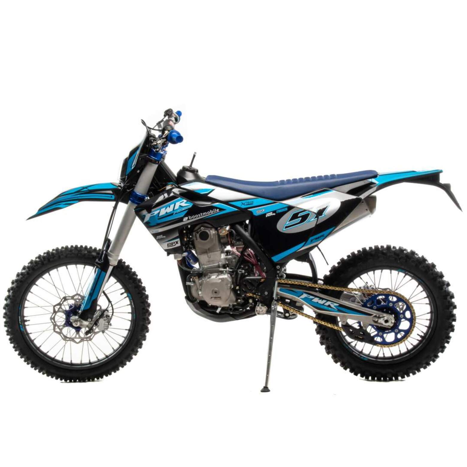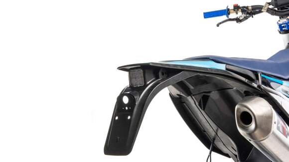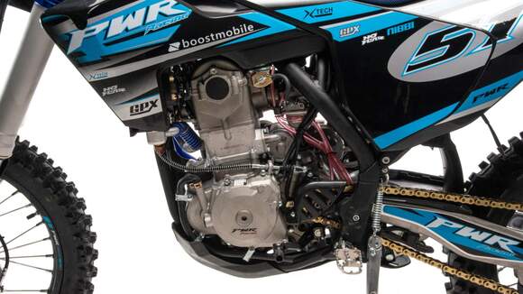 Топовый мотоцикл линейки PWR выглядит соответствующе — стильно и солидно. Без лишнего пафоса, но с уверенностью в собственном превосходстве над аналогами. Как и другие модели PWR, кроссовq 450 кубовый мотоцикл покрыт комбинированным пластиком, который не ломается при сгибании. Все стыки идеально подогнаны, наклейки ровные. Кроссовый мотоцикл доступен в синем цвете — внешний вид кросса подчёркивает несгибаемый характер и нацеленность на бескомпромиссную спортивную борьбу. Длина FS450 NC — 2160 мм, высота по седлу — 960 мм. Хорошее соотношение, которое подойдёт большинству пользователей среднего и большого роста.На кроссовый мотоцикл установлен руль переменного сечения (28 мм в месте крепления и 22 мм на концах под грипсами) с низким подъёмом и с подушкой IGP.