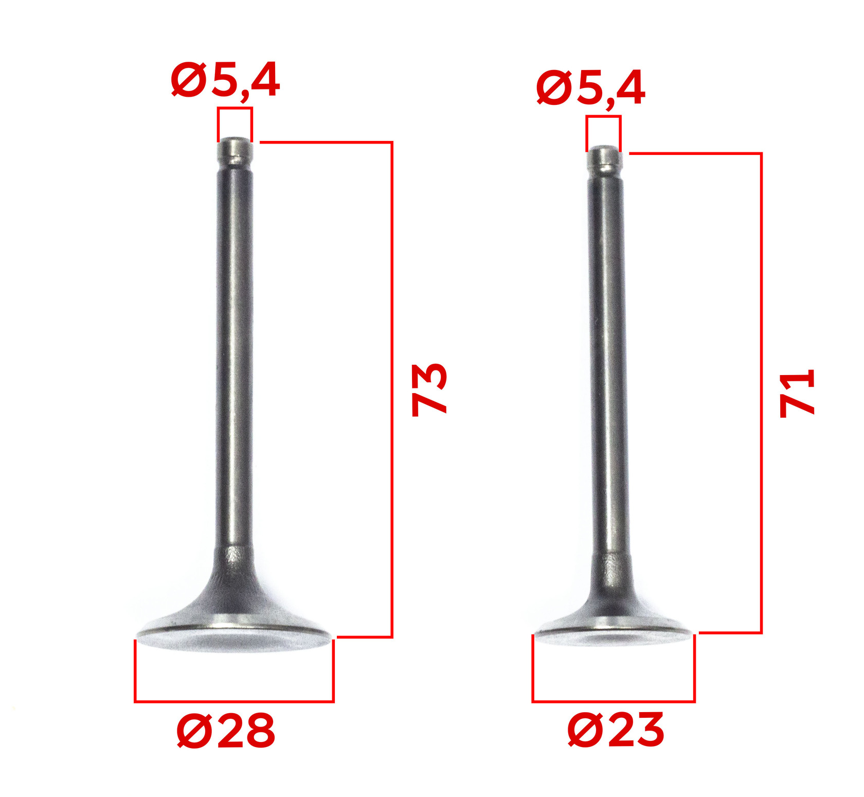 Подходит для :YX150/160, ZS155/160, YX150E.Размеры согласно схеме:A (Длина выпускной) = 71 мм, (впускной) = 73 мм B (Диаметр тарелки впускной) 28 мм, (выпускной) = 23 ммC (Диаметр ножки) = 5 мм