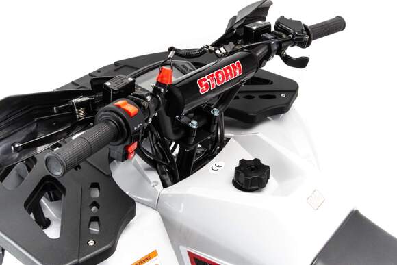 Квадроцикл Motoland (п) 125 STORM A - cтильный, современный, универсальный квадроцикл подойдет вашему ребенку как мальчику, так и девочке. Его утилитарный дизайн разработан с учетом вкусов современного поколения и понравится всем без исключения.Квадроцикл не предназначен для дорог общественного пользования. Его 8 дюймовые колеса на хорошей внедорожной резине с легкостью преодолеют все преграды в виде грязи, песка, луж и кочек. А что еще нужно для веселых покатушек в выходные дни?У этого квадроцикла отличная управляемость в любых условиях эксплуатации, благодаря грамотной настройке подвески. Данный квадроцикл оснащен автоматической коробкой передач с реверсом, который установлен на усиленной раме, что дает уверенность в прочности конструкции.Ваш ребенок быстро овладеет навыками езды на данной технике и получит массу запоминающихся эмоций.Квадроцикл оснащен двигателем 1P54FMI 125 см3, мощностью 8 л.с. c воздушным охлаждением, электрстартером, LCD (электронная) панелью приборов, светодиодной оптикой, стоп-сигналомДля безопасности имеется чека отключения двигателя, если ребенок отпускает руль, то мотоцикл практически сразу отключается при разрыве чеки.Максимальная скорость 60 км/ч. Объем топливного бака составляет 3,5 л