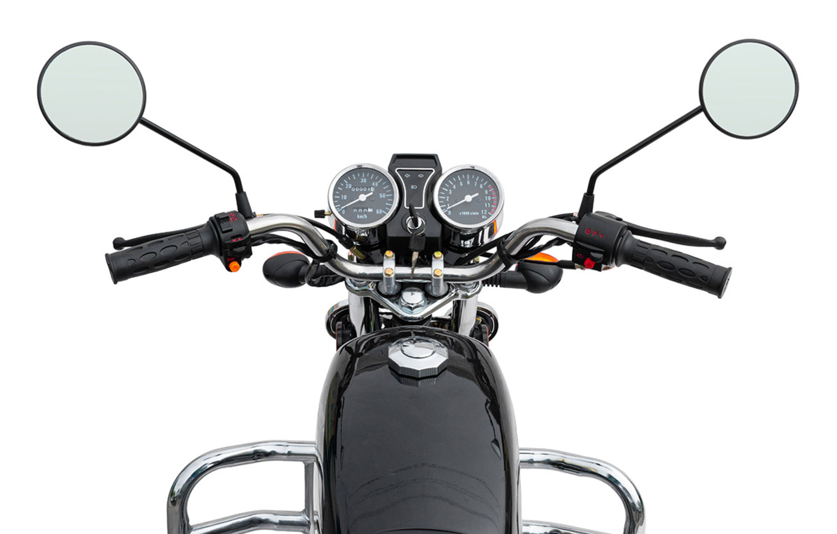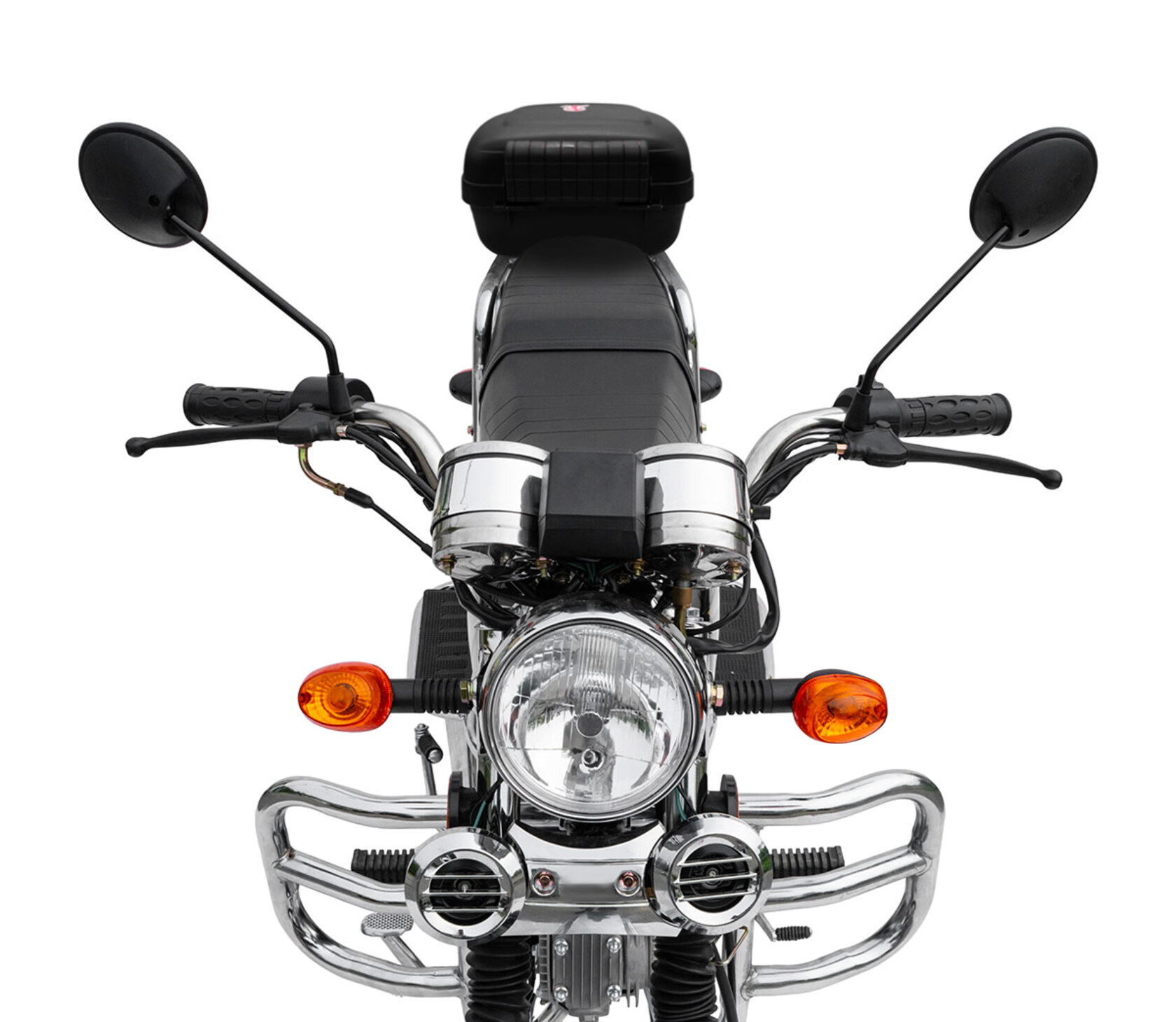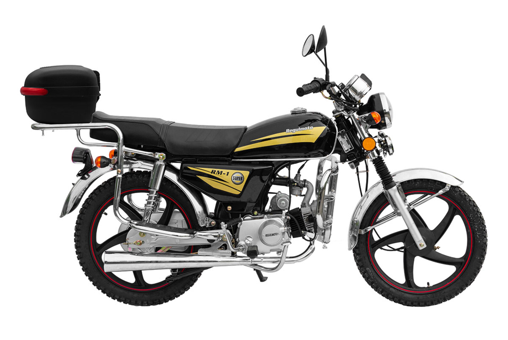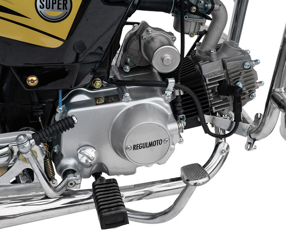 Regulmoto Alpha (RM-1) 110сс – «живая классика» китайской мотоиндустрии, один из самых доступных представителей двухколесного транспорта утилитарного назначения. Новое поколение Alpha готово продемонстрировать улучшенные показатели производительности, высокую надежность в повседневной эксплуатации и традиционную неприхотливость в сервисном обслуживании. Данный мопед комплектуется надежным «кабовским» двигателем – одноцилиндровым 4-тактником воздушного охлаждения с 4-ступенчатой трансмиссией. Рабочий объем мотора увеличен до 110 см3 благодаря установке нового комплекта ЦПГ на заводе-изготовителе. Запуск двигателя возможно осуществить как при помощи кнопки электрострартера, так и при помощи рычага традиционного кик-стартера. Увеличение рабочего объема мотора заметно сказывается как на максимальной развиваемой мощности, которая составляет чуть больше семи лошадиных сил, так и на эксплуатационных характеристиках техники.Среди других усовершенствований комплектации обновленного Regulmoto Alpha (RM-1) следует отметить более мощные передние амортизаторы (диаметр до 28 миллиметров), усиленные тросы переднего тормоза и сцепления, современную светодиодную лампу в фаре головного света. Кроме того, на Regulmoto Alpha (RM-1) установлен полный комплект светотехники, зеркала заднего вида, аналоговая приборная панель, на которой отображаются пробег, скорость, выбранная передача, обороты двигателя, индикаторы работы поворотников и фары. Также имеются подножки для пассажира, багажный кофр, кожух защиты цепи и дуги безопасности.Владелец новенького Regulmoto Alpha (RM-1) по достоинству оценит экономичный двигатель, высокую надежность конструктивных решений и доступную стоимость сервисного обслуживания техники. Мопед полностью готов к комфортному использованию на дорогах города и проселках пригорода и способен успешно справляться с широким кругом эксплуатационных задач.