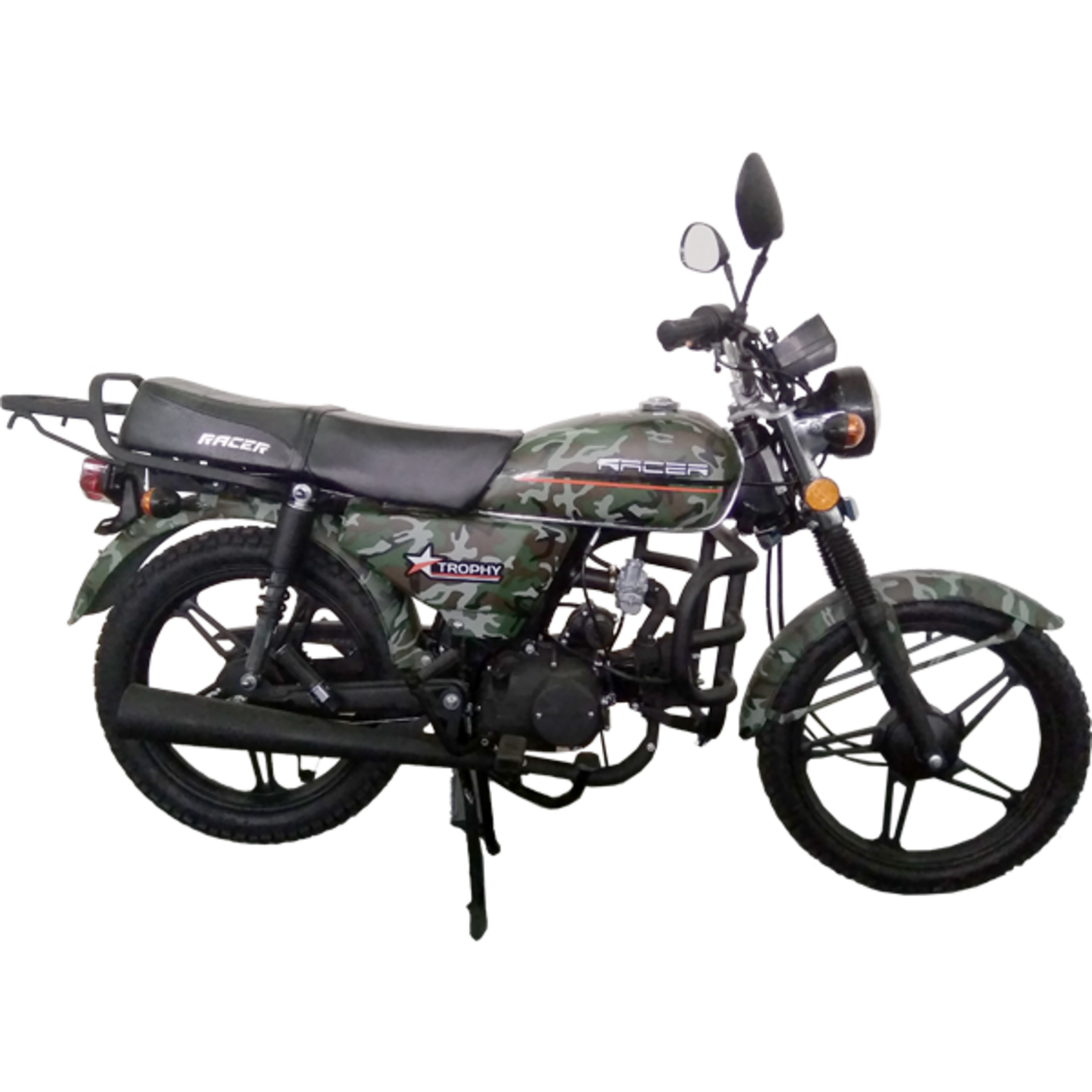 Racer RC110N-K Trophy - недорогой малокубатурный мотоцикл, на котором приятно поездить на асфальте и ровным проселочным дорогам. Сердцем мотоцикла является одноцилиндровый четырехтактный двигатель объемом 107 см³ и мощностью 7,1 л/с. Трансмиссия: механическая (1-N-2-3-4). Надежные барабанные тормоза идеально подходят для мотоцикла такого класса. Цепной привод защищен специальным кожухом. Имеются стальные дуги безопасности. Колеса: легкосплавные алюминиевые, с покрышками 2,50-17 / 2,75-17. Расход топлива 2,2 л/на 100 км при объеме бака 6 л.