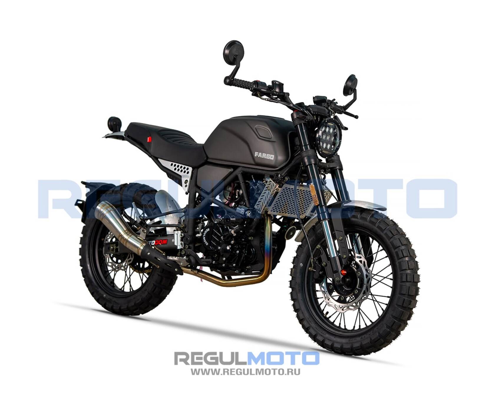 Regulmoto Fargo 300 новинка 2024 года!УправлениеУдобная прямая посадка позволяет как неспешно передвигаться, любуясь пейзажами, так и маневрировать на бездорожье или в городском потоке. Байк отличается послушностью, а тормоза обеспечивают замедление с любой скорости.Колеса и подвескаПередняя перевернутая вилка мягкая и плавная. Это позволяет преодолевать с комфортом даже самые «убитые» дороги. Задний моноамортизатор обеспечивает стабильность на бездорожье и в труднопроходимых местах.Колеса на Fargo 300 имеют эффектный внешний вид. Широкие шины с выраженным шипом обеспечивают отличное сцепление с любой поверхностью, а спицованные диски защищают байк от загрязнения и выхода из строя.ДвигательВ версии Regulmoto Fargo 300 используется двигатель от известного производителя Zongshen 174MM (CBS300) с водяным охлаждением и карбюратором Nibbi Racing PWK 34. Объединяя инновационные технологии и высокую производительность, он обеспечивает отличную динамику, экономичность и долговечность, делая каждую поездку ещё более впечатляющей.РамаРама Regulmoto Fargo 300 имеет классическую компоновку. Сварная штампованно-трубчатая конструкция имеет выверенный баланс между весом и жесткостью, что позволяет раме выдерживать высокие нагрузки и оставаться легкой.КППКороткие передачи 6-ступенчатой КПП хорошо зарекомендовали себя на бездорожье. Вместе с эластичным мотором они позволяют ровно двигаться без выкручивания газа до упора, а жидкостный радиатор охлаждения защищает мотор от перегрева.Regulmoto Fargo 300 — редкий случай, когда в одном мотоцикле идеально сочетается стиль и функциональность. Это настоящий скремблер — мотоцикл, построенный на базе лёгкого городского байка, приспособленного к передвижению вне дорог за счёт установки более длинноходных подвесок и внедорожных шин.При этом мотоцикл отлично вписывается в городской пейзаж, с лёгкостью преодолевает пробки, а за его пределами позволяет срезать путь, прохватив по грунтовкам.